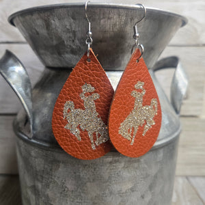 Bucking Horse & Rider®️ Leather Earrings~ Rust & Champagne Glitter