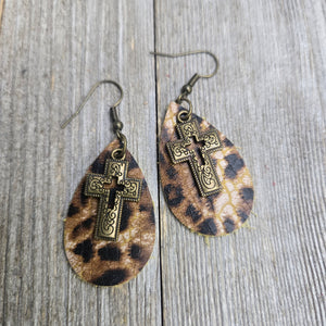 Itty Bitty Scrolled Cross Leather earrings~ Leopard & Bronze Scroll
