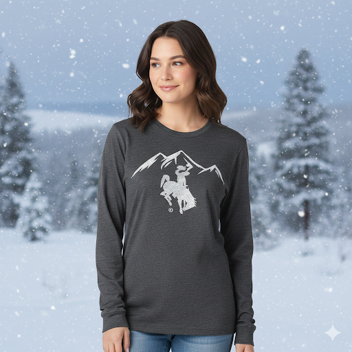 Gray long-sleeve shirt with mountain and horse graphic on a mannequin against a neutral wall.